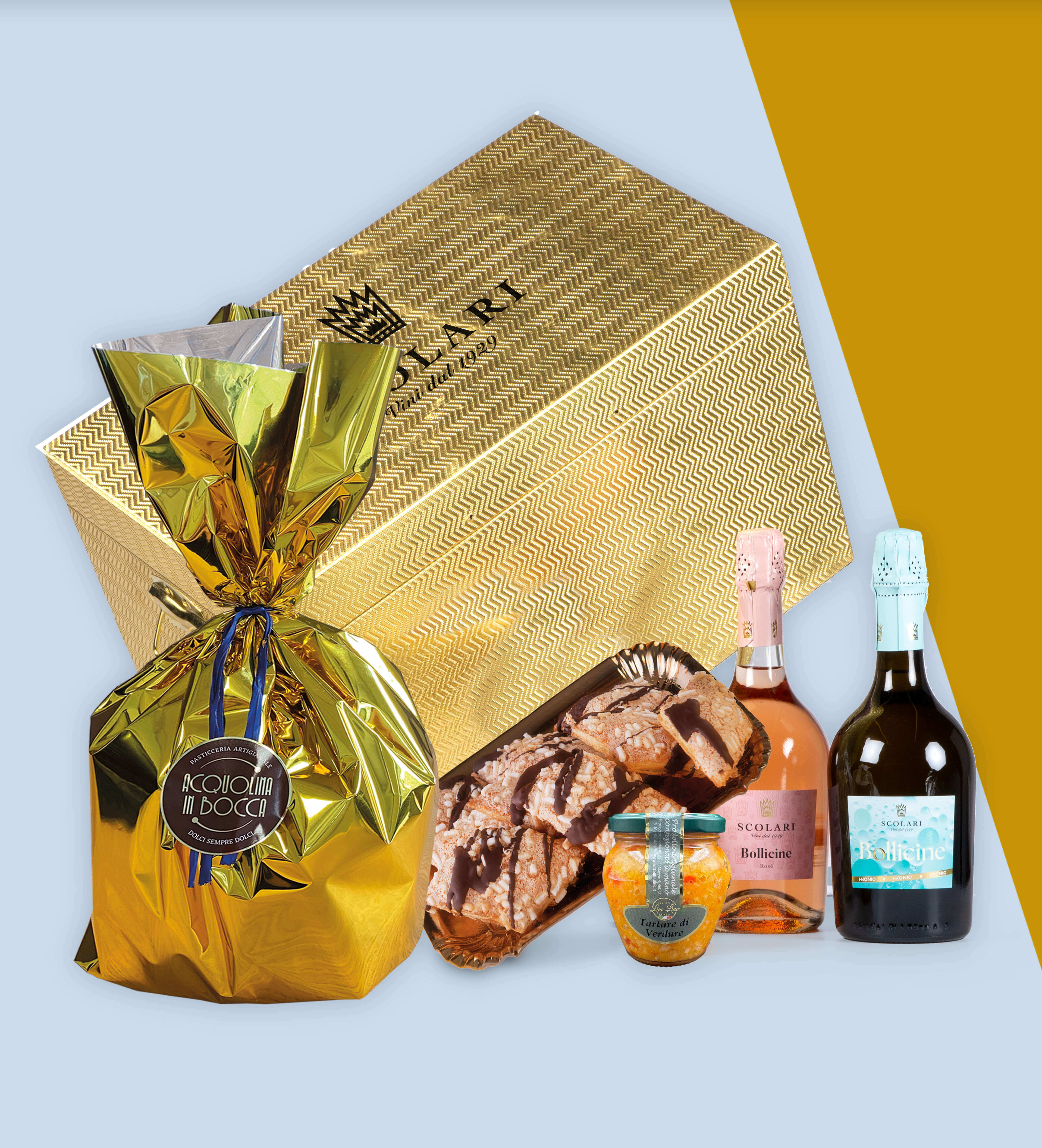 Baule Gold, Biscotti al caffè, Tartare di verdure, Panettone Lux, Bollicine I-konic, Bollicine Rosè